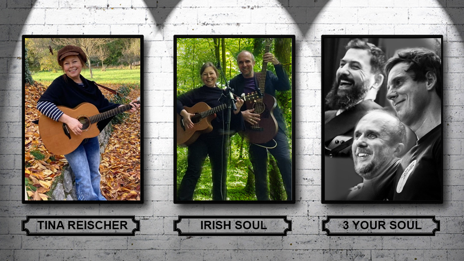 19:30 SET1: Tina Reischer Ohne Musik wäre das Leben wohl ziemlich farblos. Musik ist für Tina „Wickerl“ Reischer ein Grundbedürfnis, wie Atmen oder Essen. Das war wohl auch schon immer so. Sie liebt es von Zeit zu Zeit auf unterschiedlichsten Bühnen und Veranstaltungen ihre Wohlfühlmusik darzubieten. Mit ihrer akustischen Gitarre interpretiert sie zahlreiche Cover-Songs aber auch Songs aus der eigenen Feder. Ihre Musik ist emotional und ihre Stimme sehr warm und bodenständig. 20:30 SET2: Irish Soul Irische Singer/Songwriter sind die gemeinsame Leidenschaft des Duos von Irish Soul. Von diesen/jenen werden einige Songs mit großer Intensität und Spielfreude dargeboten. Wenn man sich gemeinsam für eine Sache begeistert, schwingt das musikalische Ergebnis in der Darbietung dann doch noch etwas höher. Van Morisson, Glen Hansard und Co. lassen schön grüßen. 21:30 SET3: 3 YOUR SOUL covern, aber nicht im eigentlichen Sinn, sondern ohne Anspruch auf Originaltreue und mit kreativer Eigenauslegung. Man könnte auch sagen, sie „recovern“ die Songs. Das Wesen, die Seele der Lieder ist da, aber alles rundherum wird frei gestaltet - immer mit etwas Groove, manchmal mit einer Portion Funk, durchwegs rockig. Die 3-4 Herren von 3 YOUR SOUL servieren zum Abschluss des heutigen Abends ein kompaktes best of set!